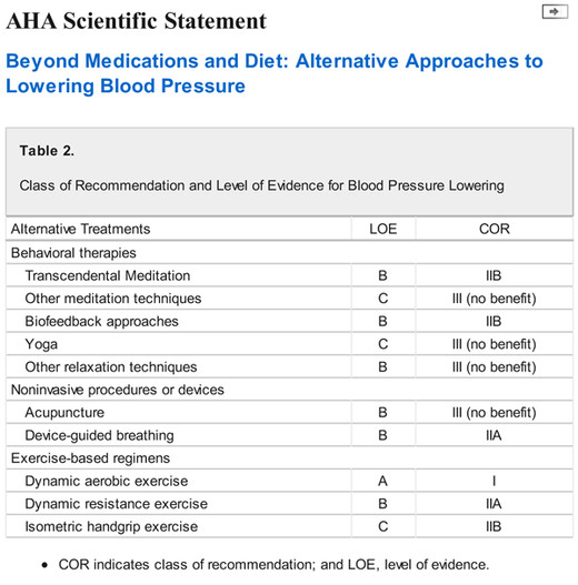 "This American Heart Association scientific statement aims to summarize the blood pressure–lowering efficacy of several alternative approaches and to provide a class of recommendation for their implementation in clinical practice based on the available level of evidence from the published literature."(Abstract - page 2)