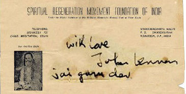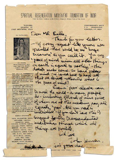 The letter was written by Lennon on his visit with the Beatles to Rishikesh, India, where they were enrolled on an advanced transcendental meditation training session at the ashram of Maharishi Mahesh Yogi. He writes in response to a mysterious request from a fan: