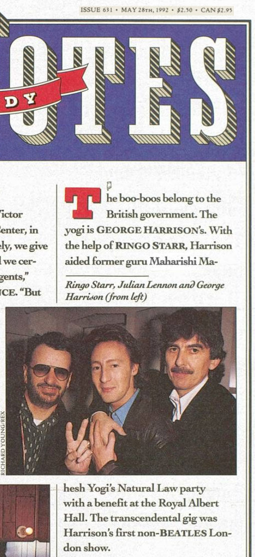 Le journal de la chaine MTV annonce l'initiative de George Harrison de donner un concert au Royal Albert Hall le 6 avril 1992, pour soutenir la campagne du jeune Parti de la Loi Naturelle (PLN) qui veut amener un changement en politique en amenant la notion et l'expérience de la conscience pure comme solution aux problèmes de la société à travers la méditation transcendantale. Ce sera son premier concert depuis 1969, et le seul concert solo qu'il donnera au Royaume-Uni. Le slogan de ce parti, maintenant dissous, était : « Seule une nouvelle graine peut donner une nouvelle récolte ». |