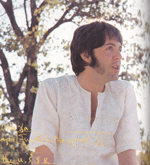 PAUL : J'ai écrit deux ou trois petites choses là-bas. J'avais une chanson intitulée « I Will », mais je n'avais pas de paroles. Et puis j'ai écrit un bout de « Ob-la-di, Ob-la-da ». On allait voir des films au village. Un type installait un écran mobile et tous les villageois arrivaient. Ils adoraient ça. Je me rappelle avoir emprunté un petit sentier dans la jungle pour aller du village au camp. J'avais ma guitare et je chantais : « Desmond had a barrow in the market place... »
