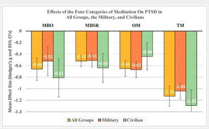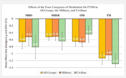 David Orme-Johnson, professeur émérite de l’Université de l’Illinois à Chicago à (UIM), explique : « Nos résultats montrent que toutes les techniques de méditation étudiées peuvent aider à soulager les symptômes du syndrome de stress post-traumatique SSPT (PTSD), mais que mais la MT se distingue par la réduction la plus importante et la plus constante des symptômes chez diverses populations traumatisées. Les études montrent que la MT fonctionne chez les hommes et les femmes, chez les jeunes et les personnes âgées, chez les anciens combattants et les réfugiés de guerre, chez les femmes ayant survécu à la violence interpersonnelle, chez les détenus, chez les survivants du tsunami et du tremblement de terre, et chez les infirmières qui ont été traumatisées pendant la pandémie de 2019 ».